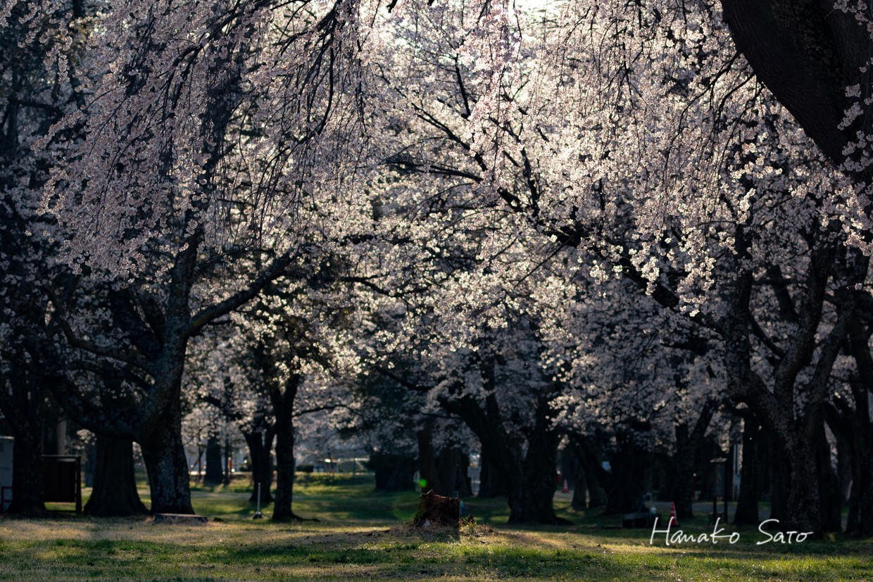 再び茨城牧場に戻って、夕日色に染まっていく桜を撮る。